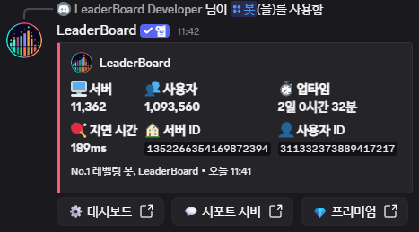 서버 수, 유저 수, 업타임, 핑 등 봇의 전반적인 상태를 한눈에 볼 수 있어요.