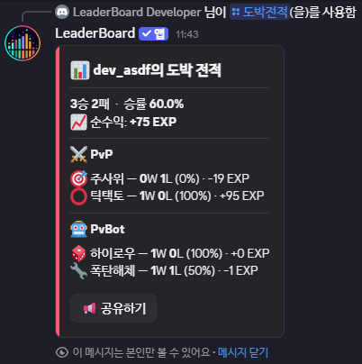 /도박전적 PvP 및 PvBot 게임 전적을 확인할 수 있어요. 사용법 /도박전적 승리, 패배, 승률 등 게임 전적을 한눈에 볼 수 있어요. 💡공유하기 버튼을 눌러 전적을 채팅에 공개할 수 있어요.