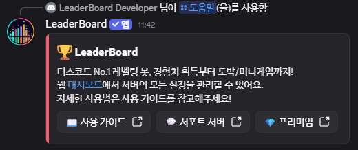 명령어 목록과 함께 대시보드, 서포트 서버 등의 링크를 제공해요.