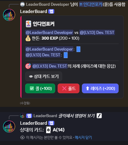 /인디언포커명령어와 함께 베팅할 경험치를 입력해요.- 상대방이 수락하면 게임이 시작돼요.