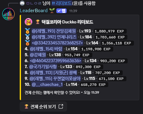 /리더보드 서버 내 경험치 순위를 확인할 수 있어요. 사용법 /리더보드 총 4가지 종류의 리더보드를 제공해요: 리더보드설명총 경험치누적 총 경험치 순위월간이번 달 획득 경험치 순위누적 출석총 출석 횟수 순위연속 출석연속 출석 일수 순위 💡각 리더보드는 10명씩 표시돼요.