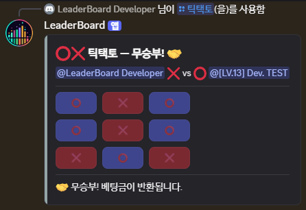 /틱택토명령어와 함께 베팅할 경험치를 입력해요.- 상대방이 수락하면 게임이 시작돼요.