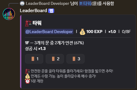 /타워명령어와 함께 베팅할 경험치를 입력해요.- 8층짜리 타워가 나타나요.